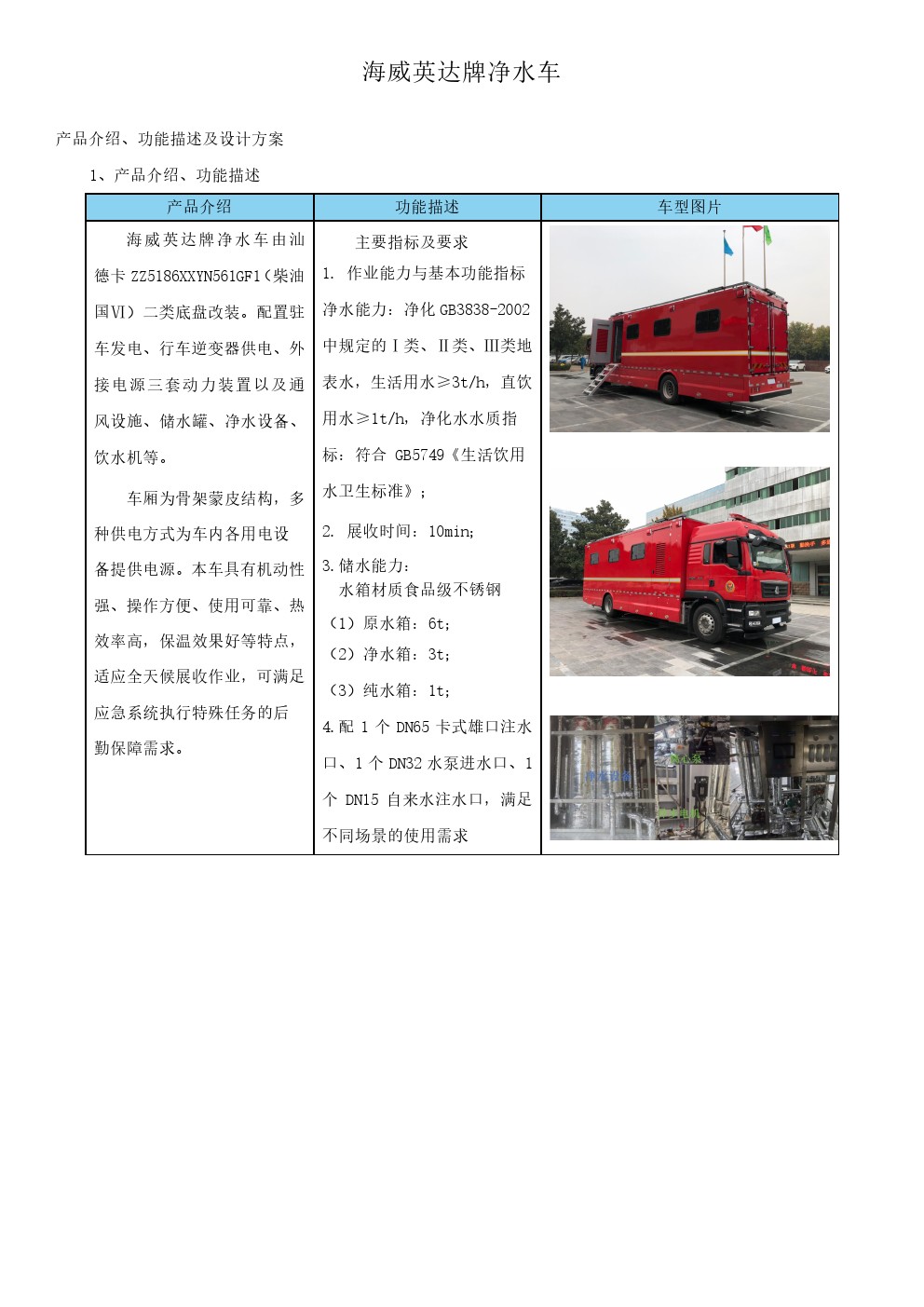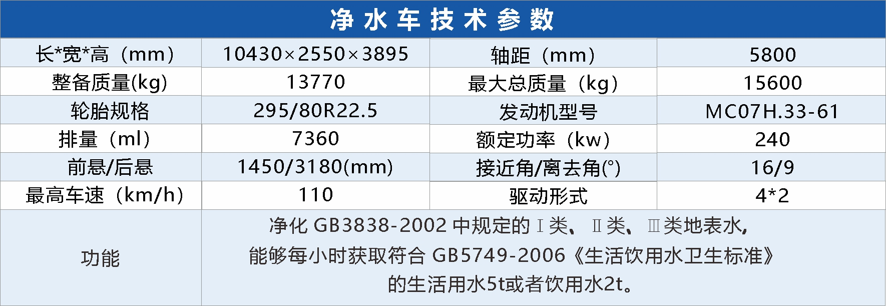 具備水質凈化功能,能夠將自然界中的河水、湖水等非飲用水源凈化為可飲用的干凈水,為救援人員和受災群眾提供生活用水和飲用水。